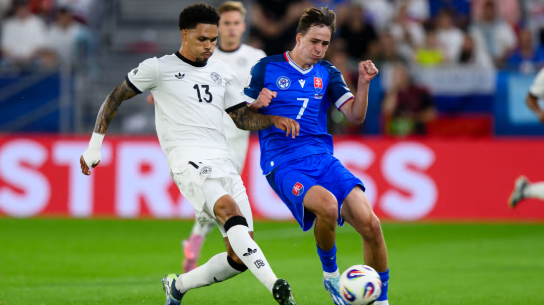 不仅有球时节奏拖沓,球员相互间感觉并不认识,无法持续向对手施压,德国队的高位逼抢强度也不够,而科林斯在右路的一对一防守能力和选位更是一塌糊涂。从20分钟过后,科林斯的身后就被两次轻易打穿,丢球前他更是被表现活跃的斯洛伐克左边锋莱奥·绍尔轻松人球分过。丢球之后,科林斯又一次被绍尔轻松过掉后只能立即拉倒对手犯规,但其实基米希已经协防到位,根本不需要多此一手,可见科林斯已经有点不知所措。